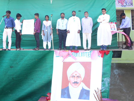 கல்லூரி முதல்வர் முனைவர் எல். இரவி அவர்கள், வளாகத் தந்தை, புல முதன்மையர் தந்தை அவர்கள் மற்றும் துறைத்தலைவர்கள் பாரதியார் புகைப்படத்திற்கு மலர் தூவி மரியாதைச் செலுத்தினர்.